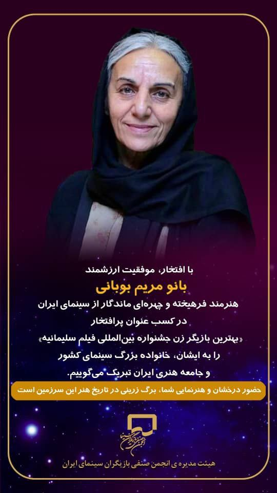 روابط عمومی انجمن بازیگران اعلام کرد: مریم بوبانی چهره ای ماندگار از سینمای ایران عنوان بهترین بازیگر زن جشنواره بین المللی فیلم سلیمانیه را کسب کرد.