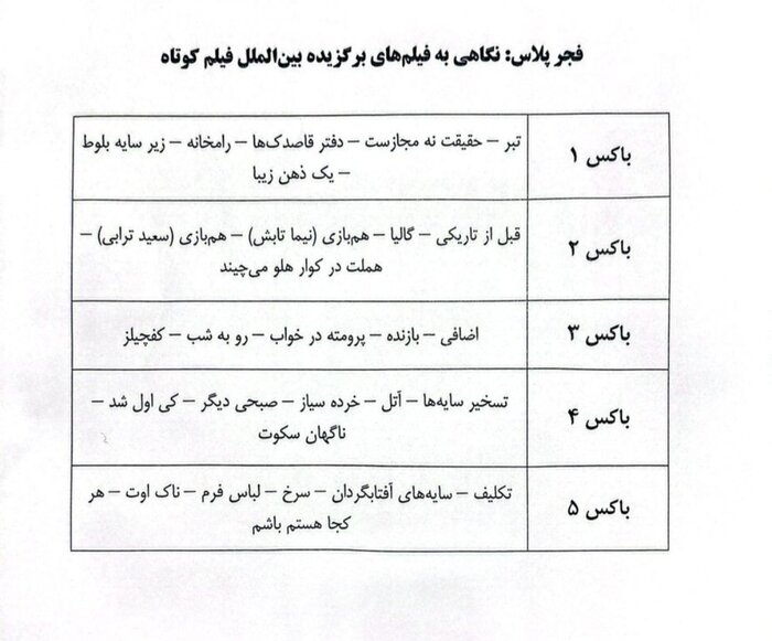 وی ادامه داد: از دیگر فیلمهای برگزیده میتوان به «پرومته در خواب» ساخته مسعود احمدی، «روبه شب» ساخته سعید کشاورز، «کفچلیز» ساخته شیوا بافهم، «تسخیر سایهها» ساخته فاطمه اکرمی، «آتل» ساخته مهدی صدیقی، «خرده سیاره» ساخته احسان شادمانی، «صبحی دیگر» ساخته مهران جهاندیده، «کی اول شد» ساخته قیام کرمی شیرازی، «ناگهان سکوت» ساخته سیده منصوره موسوی، «تکلیف» ساخته محمدحسین فتحی، «سایه های افتاب گردان» ساخته رویا زنبق، «سرخ» ساخته محمد رازدار، «لباس فرم» ساخته محمدرضا دهقان و پرهام کاویانی، «ناک اوت» ساخته امیرحسین خباززاده و «هرکجا هستم باشم» ساخته علی نیکومنش اشاره کرد.